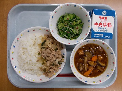 ご飯 牛乳 スタミナ丼 うめちり和え みそ汁