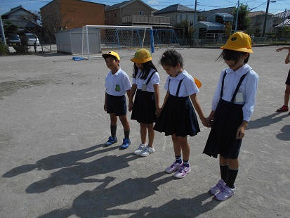 4時間目、3年生の子どもたちが運動場で手をつなぎ、地面を見ていました。