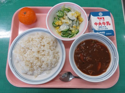 金芽ロウカット玄米ごはん、牛乳、ハヤシライス、コーンサラダ、冷凍みかん