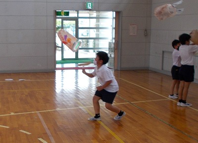 3年生の図画工作で、ビニール袋に好きな絵を描き、扇風機やうちわで風にのせて楽しむ「ふきあがる風にのせて」という授業を行いました。子どもたちが扇風機に袋をかざして手を離すと、袋が高く舞い上がります。それを床に落とさないよう、うちわで下から一生懸命あおぎました。袋をうまく浮かせるのは難しそうでしたが、みんなで楽しく活動することができました。