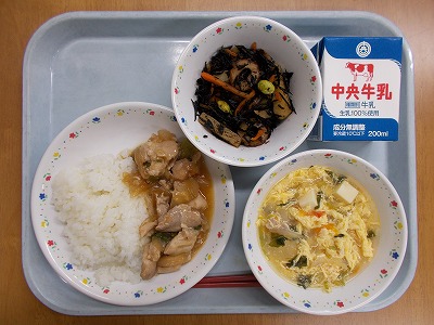 ご飯 牛乳 おいだれ焼き鳥丼 ひじきの炒め煮 トマトと卵のふんわり汁