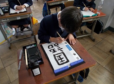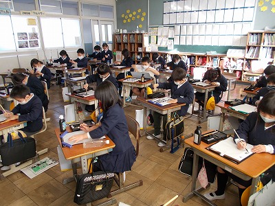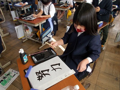 今日は3年生が書き初めを行いました。今年の目標やがんばりたいこと、がんばりたい教科など、自分で選んだ言葉を習字で書き、年の初めの決意を新たにしました。