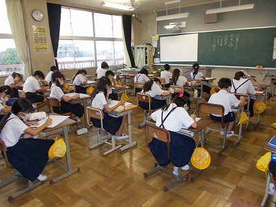激しい風雨でしたが、5年生の教室では児童が落ち着いた様子でプリントに取り組んでいました。
