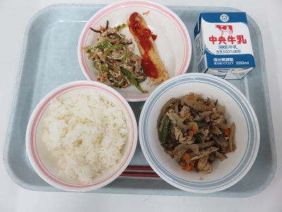 ごはん、牛乳、五目きんぴら、ウインナーの天ぷら、無限ピーマン