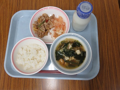 ごはん、牛乳、チャプチェ、いかキムチ、韓国風わかめスープ