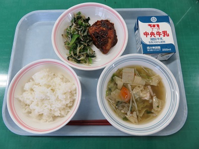 ごはん、牛乳、カツオの梅みそ焼き、小松菜ともやしの磯あえ、ゆばとめかぶの澄まし汁