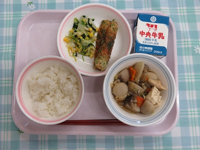 ごはん、牛乳、芋煮、竹輪の磯辺揚げ、白菜とコーンの和え物
