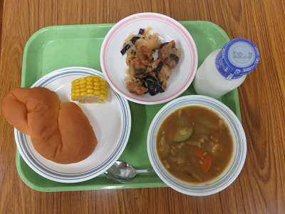 クロスロール、牛乳、野菜と揚げ豚肉のさっぱり和え、カットコーン、夏野菜のカレースープ