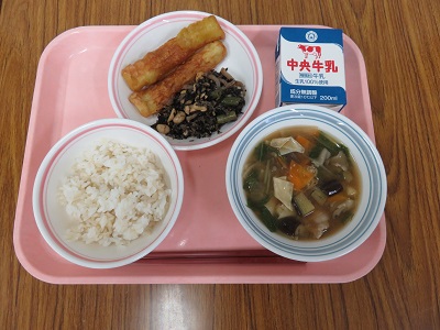 金芽ロウカット玄米ごはん、牛乳、竹輪のスパイシー風味、ひじきの炒め煮、京風みそ汁