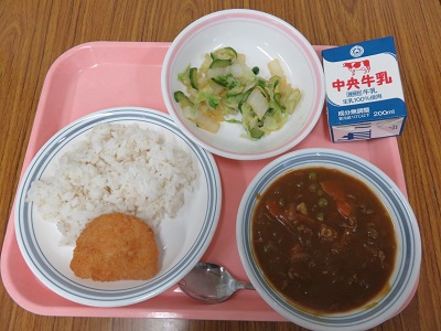 麦ごはん、牛乳、カレーライス、一口カツ、白菜のあっさり漬け