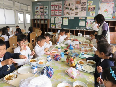 「食べ物の名前や仲間を知ろう」というテーマで、今日の献立についての話を聞きました。みんな、給食の中に入っている食べ物の名前や仲間が分かったかな?初めてのランチルームでの会食でしたが楽しく食べられたようで、今日も完食でした!