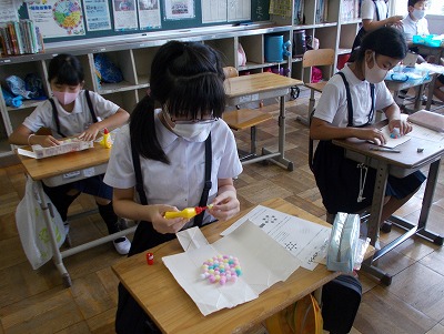小さなポンポンを木工ボンドで接着して作る「ポンポンコースター」の制作に取り組みました。(家庭科クラブ)その他のクラブでも、みんながんばって活動に取り組みました。