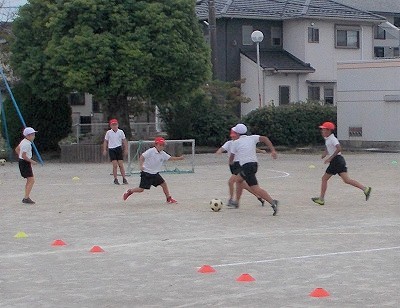 お互いに声を出しながらゴール目指してボールを追いかけました。(サッカークラブ)