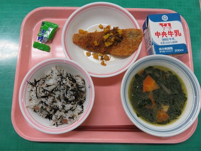 梅ひじきごはん、牛乳、ほっけフライのコーンソース、けんちん汁、黒糖