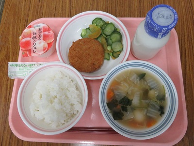 ごはん、牛乳、里芋コロッケ、即席漬け、うずら卵入り白玉汁、白桃ジュレ