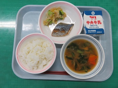 ごはん、牛乳、鰆のゆず塩麹焼き、大根サラダ、あったか冬至汁