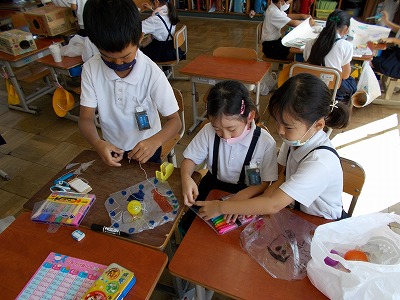 2年生は、おもちゃランドで2年生に遊んでもらうためのおもちゃ作りを行いました。グループに分かれて、ボーリング、パラシュート、木登りざる、空気砲、けん玉、魚釣りなどのおもちゃを作りました。どのグループも、どうしたら1年生に楽しんでもらえるかを考え、工夫しながら取り組んでいました。