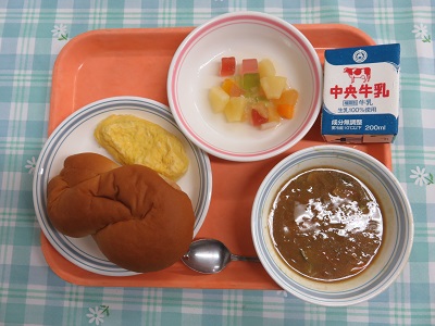 クロスロールパン、牛乳、オムレツ、夏野菜のカレースープ、フルーツ和え
