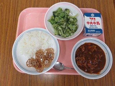 ごはん、牛乳、ハヤシライス、れんこんチップス、グリーンサラダ