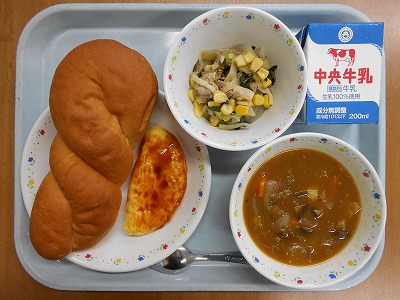 クロスロールパン オムレツのケチャップソースかけ 野菜いっぱいカレースープ エリンギのソテー