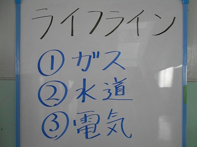 様々な意見が出ましたが、その中から「ガス、水道、電気」を選んで、ホワイトボードに書き加えました。