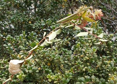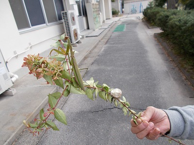 朝、昇降口東の植え込みで、カマキリが卵を産んでいました。卵だけなら目にすることもありますが、産卵の場面が見られるのはとても珍しいです。多くの子どもたちが産卵の様子を興味深そうに見ていました。