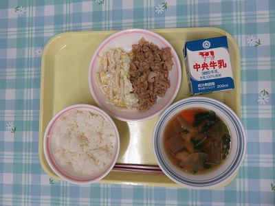 ごはん、牛乳、豚肉の生姜炒め、マカロニサラダ、吉野汁