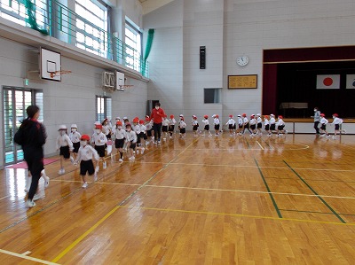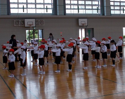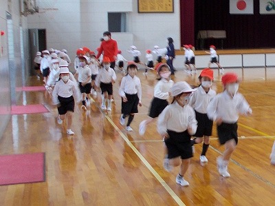 今日は1年生が体育の授業を行いました。体育館の回りを走ったり、集合して整列する練習をしたりしました。みんな元気に活動に取り組んでいました。