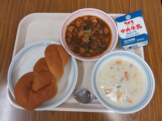 あいちのツイストロールパン、牛乳、ラタトゥイユ、クリームスープ