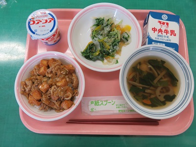 ごはん、牛乳、豚肉と生揚げのコチュジャン丼、水菜のサラダ、根菜たっぷりうまみ汁、ヨーグルト