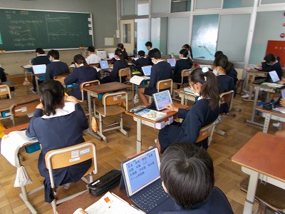 今日は5年生がタブレットを活用した算数の授業を行いました。平均で表されるものを考え、タブレットのカードに書いて提出し、全員で意見を交流しました。