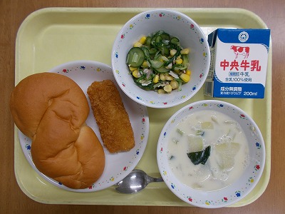 クロスロールパン 牛乳 イカフライのレモン煮 イタリアンサラダ 冬瓜の豆乳スープ