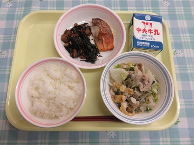 ごはん、牛乳、メバルのみそネーズ焼き、ひじきの炒め煮、美酒鍋
