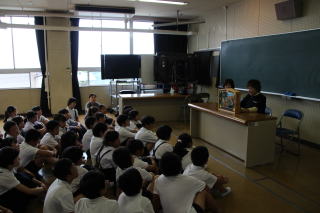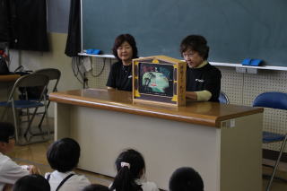 中休み、松ぼっくりのみなさんにお越しいただき、紙芝居「美女と野獣」を読んでいただきました。映画などで有名な作品ではありますが、原作を見るのは初めてだった子が多く、とても集中しながら楽しんでいました。