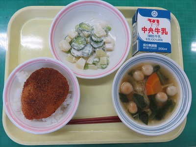 ソースカツ丼(ごはん、ソースカツ)、牛乳、ポテトサラダ、玉麩汁