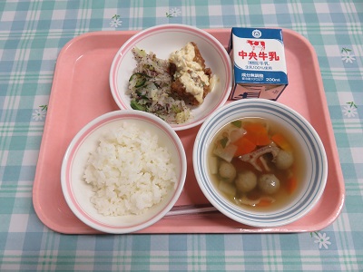 ごはん、牛乳、チキン南蛮、ゆかり和え、いわしのつみれ汁
