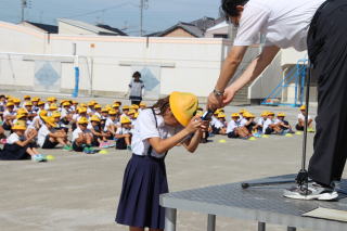 今日は子ども会のドッジボール大会で活躍した児童が表彰されました。また、海部地区の水泳大会でバタフライ1位の好成績をとった児童の表彰もあり、学校外での活躍を知ることができた朝礼となりました。