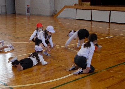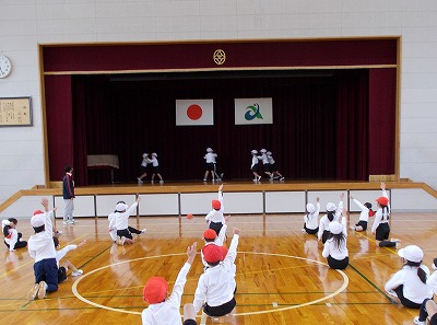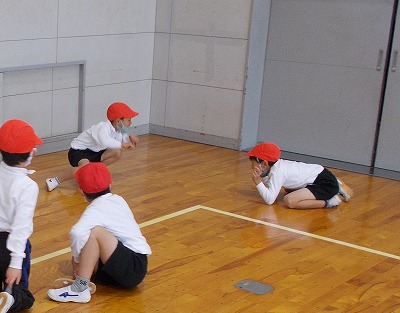 今日は1年生が体育で表現遊びの授業を行いました。「虫の国」「動物の国」「遊園地の国」「音楽の国」など、引いたカードに書かれたものの動きをグループで考えて練習し、舞台の上で発表しました。どのグループもユニークな動きを工夫し、楽しく活動することができました。