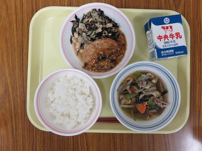 ごはん、牛乳、きのこあんハンバーグ、ひじきと大豆のサラダ、沢煮椀