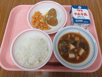 ごはん、牛乳、レバー入りつくね、にんじんしりしり、秋なすのみそ汁