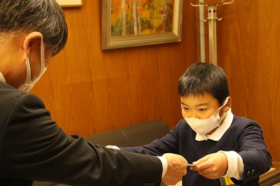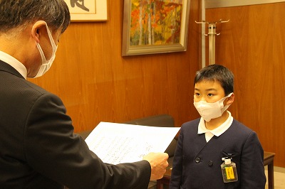 先日実施された読書感想画コンクールで、北河田小から1名が入賞しました。本日、校長室で入賞者の表彰を行いました。