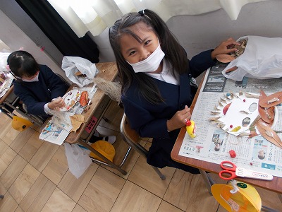 今日は1年生が、集めてきた秋の葉っぱや木の実などを使って、秋のお面作りをしました。