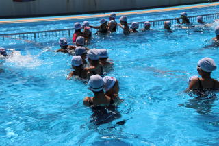 今日は、授業で行える今年最後のプール指導の日となりました。北河田小学校のプールは、低学年が主に浅いプールを、高学年が深いプールを使っています。しかし、低学年の中には深いプールで泳げることにあこがれている子もいます。そこで、今日は6年生にだっこやおんぶをしてもらいながら、1年生が深いプールを体験しました。泳ぐことは難しいですが、高学年の気分を喜んで味わっていました。