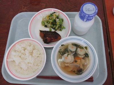 ごはん、牛乳、鯖の味勝(みしょう)焼き、菊花和え、重陽の節句汁