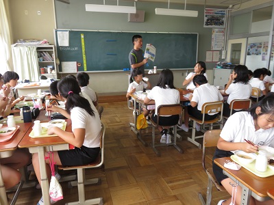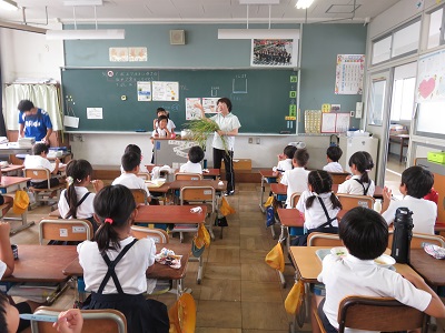 また、今日は、JAあいち海部よりいただいたとれたての新米が出ました。このお米は、弥富市の鍋田地区で生産された早場米のコシヒカリでした。校内でもバケツ稲で育ったコシヒカリを収穫しました。給食の時間にその稲を見せてもらい、たくさんの手間をかけてお米が作られているという話を聞いて、大事に食べる姿が見られました。
