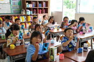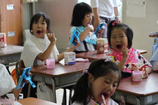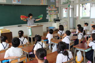 1年生の教室に赤ワニさんと緑ワニさんが登場。綱引きをするのですが、勝負の結果は・・・むし歯のないワニさんの勝ち!