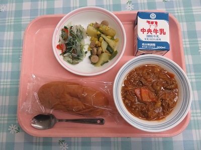愛知の米粉パン、牛乳、ビーフストロガノフ、ジャーマンポテト、水菜と海藻のサラダ
