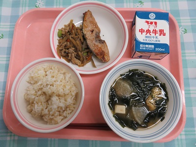 金芽ロウカット玄米ごはん、牛乳、かつおの土佐煮、きんぴらごぼう、わかめのみそ汁