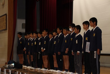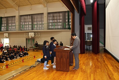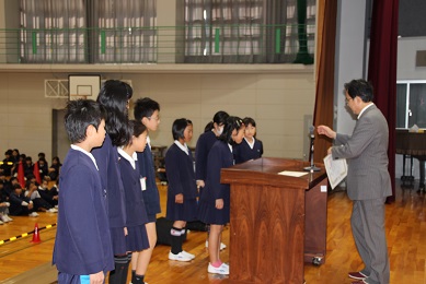 まず初めに、佐織地区サッカー競技会と、おじいさんおばあさんへの手紙の優秀作品の表彰がありました。また先週、社会見学で朝礼に出られなかった4年生の学級委員と代議員の認証も行われました。サッカーは優勝、手紙の入賞者も多くの児童が選ばれました。
