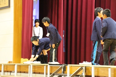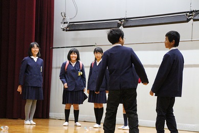 次に、美化・園芸委員会による、呼びかけがありました。「ゴミはゴミ箱へ捨てよう」、「トイレのスリッパをそろえよう」の2つを寸劇・クイズを通して全校へ呼びかけました。学習発表会の練習で教室から他の教室への移動が多い毎日ですが、みんなの使いやすい学校を目指してほしいです。
